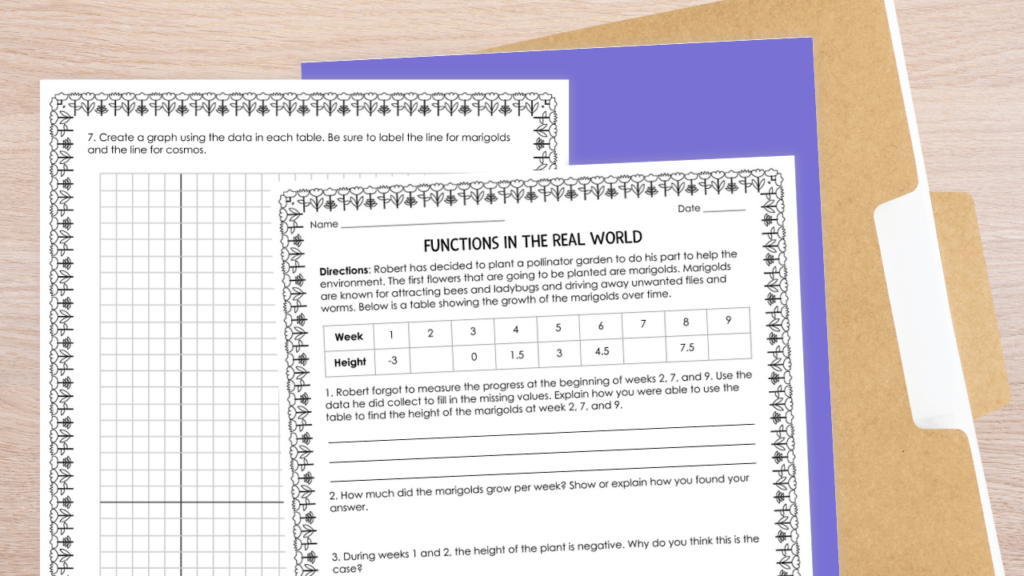 This realistic graphing linear functions activity will get your students thinking about growth rates and making predictions based on trends. They will help Robert plant a pollinator garden to do his part to help the environment. He will start by planting marigolds which are known for attracting bees and ladybugs and driving away unwanted flies and worms.