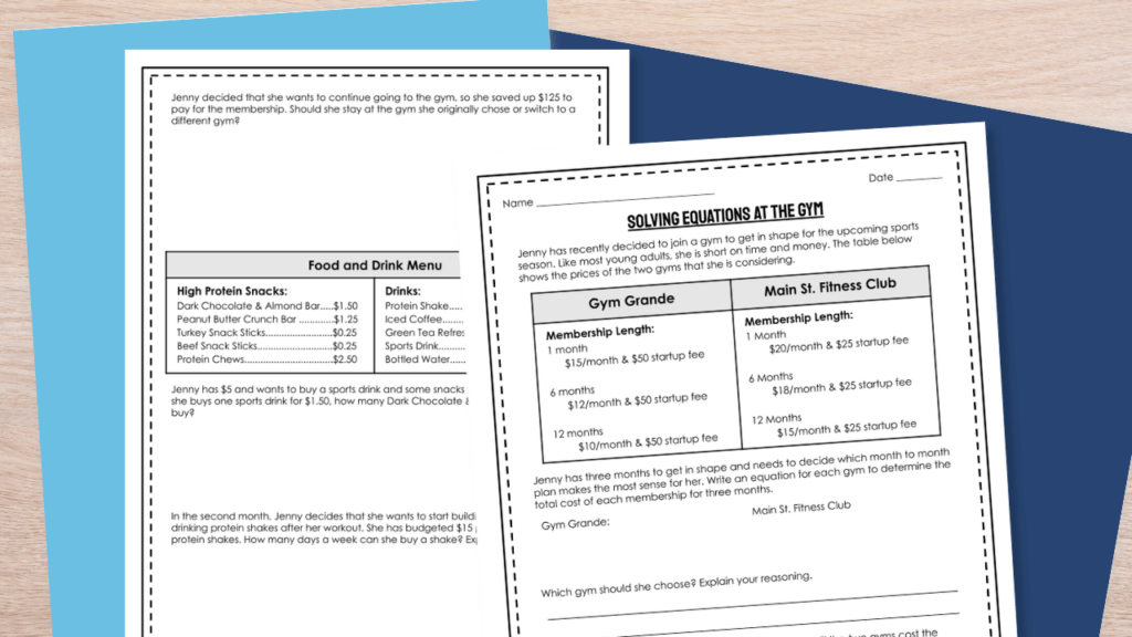 Jenny has recently decided to join a gym to get in shape for the upcoming sports season. Like most young adults, she is short on time and money. The table below shows the prices of the two gyms that she is considering. From this scenario, the students will write and solve various equations based on the cost and time constraints she has given.