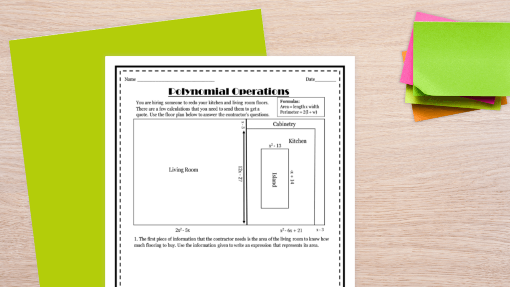 This real world math activity for adding, subtracting, and multiplying polynomials has two versions that will challenge and engage all of your students. Here’s the scenario: