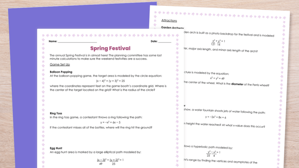 This spring-themed activity for conic sections is a perfect way to review equations of circles, parabolas, hyperbolas, and ellipses! Your students will solve each conics word problem and identify different key features. Here’s the scenario: