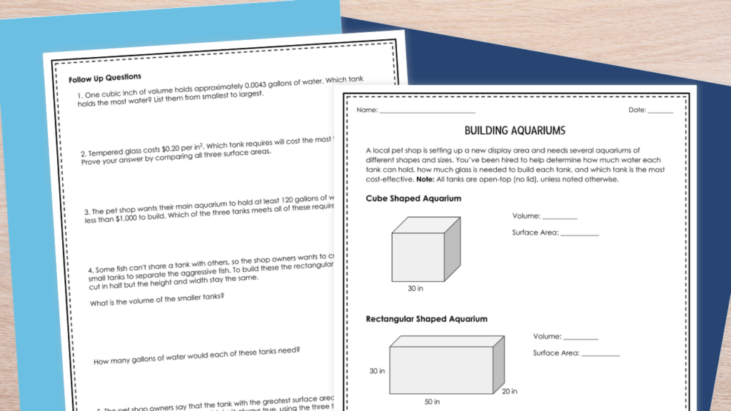This Surface Area & Volume Performance Task challenges middle school students to find the surface area and volume of rectangular prisms and cylinders to help a pet store create new fish tanks. They will use their calculations to determine how much water will fill each tank and how much glass needs to be used to construct each aquarium.