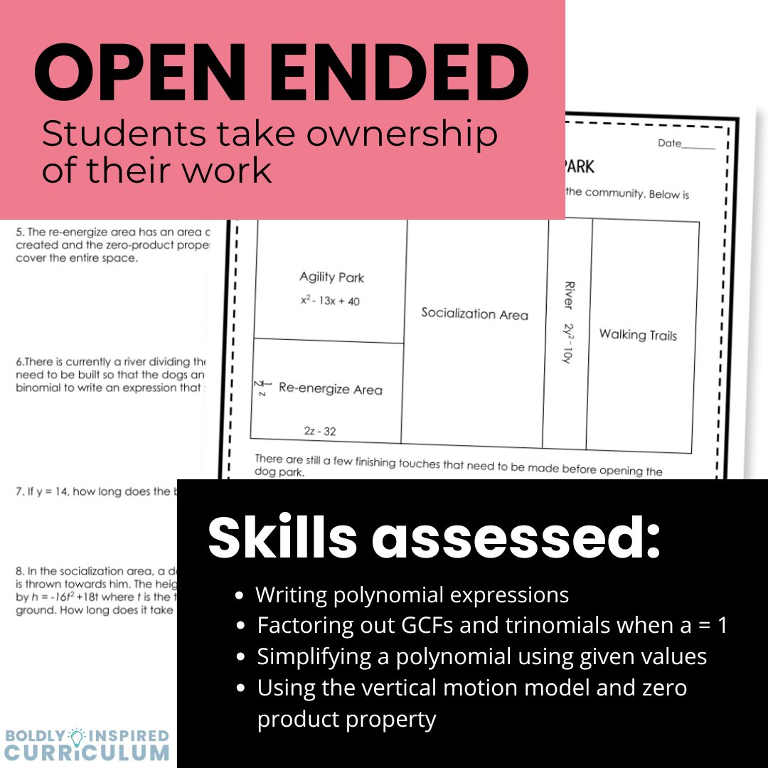 Your town is designing a new dog park and needs help adding the finishing touches. Your students will use the information given and their knowledge of multiplying polynomials and factoring quadratic expressions to fill in the missing information.