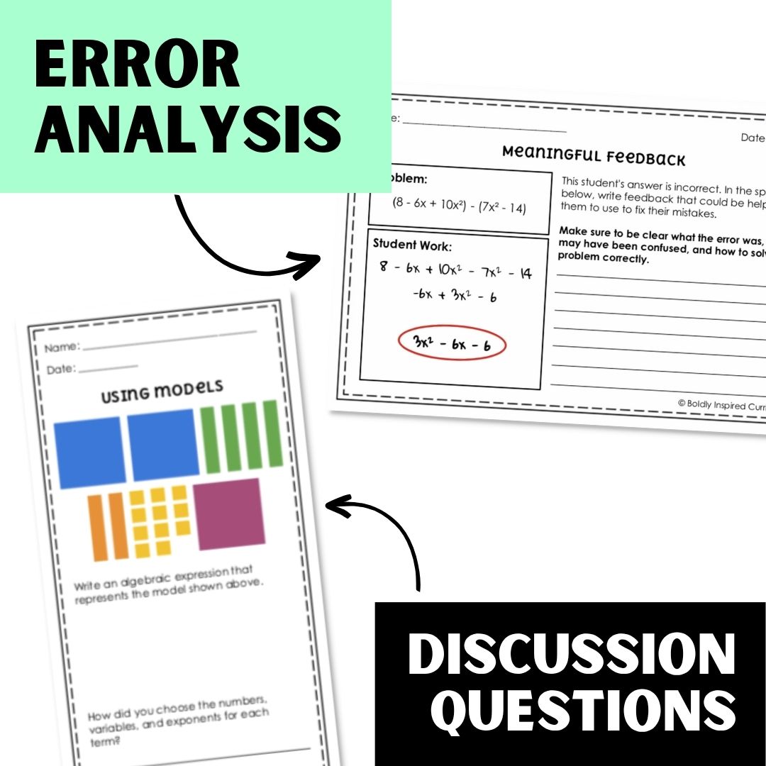 Do you want to get your students thinking critically and articulating their thoughts in your Algebra 1 class? This set of adding and subtracting polynomials warm ups and exit tickets is the perfect no prep, grab-and-go activity to supplement your current Algebra 1 curriculum.