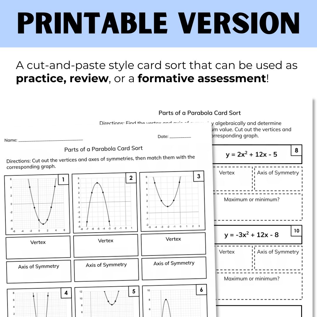 Do your Algebra 2 students need extra practice with identifying key features of quadratics? This digital and printable card sort activity for writing quadratic equations in standard form will reinforce finding the vertex, axis of symmetry, and the maximum/minimum values of each parabola.