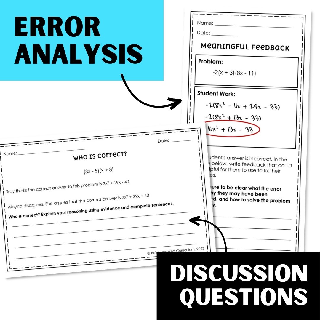 Do you want to get your students thinking critically and articulating their thoughts in your Algebra 1 class? This bundle of polynomial operations exit tickets is the perfect addition to any adding, subtracting, or multiplying polynomials lesson! These no-prep, grab-and-go writing prompts can be used as warm ups, task cards, or math journals.