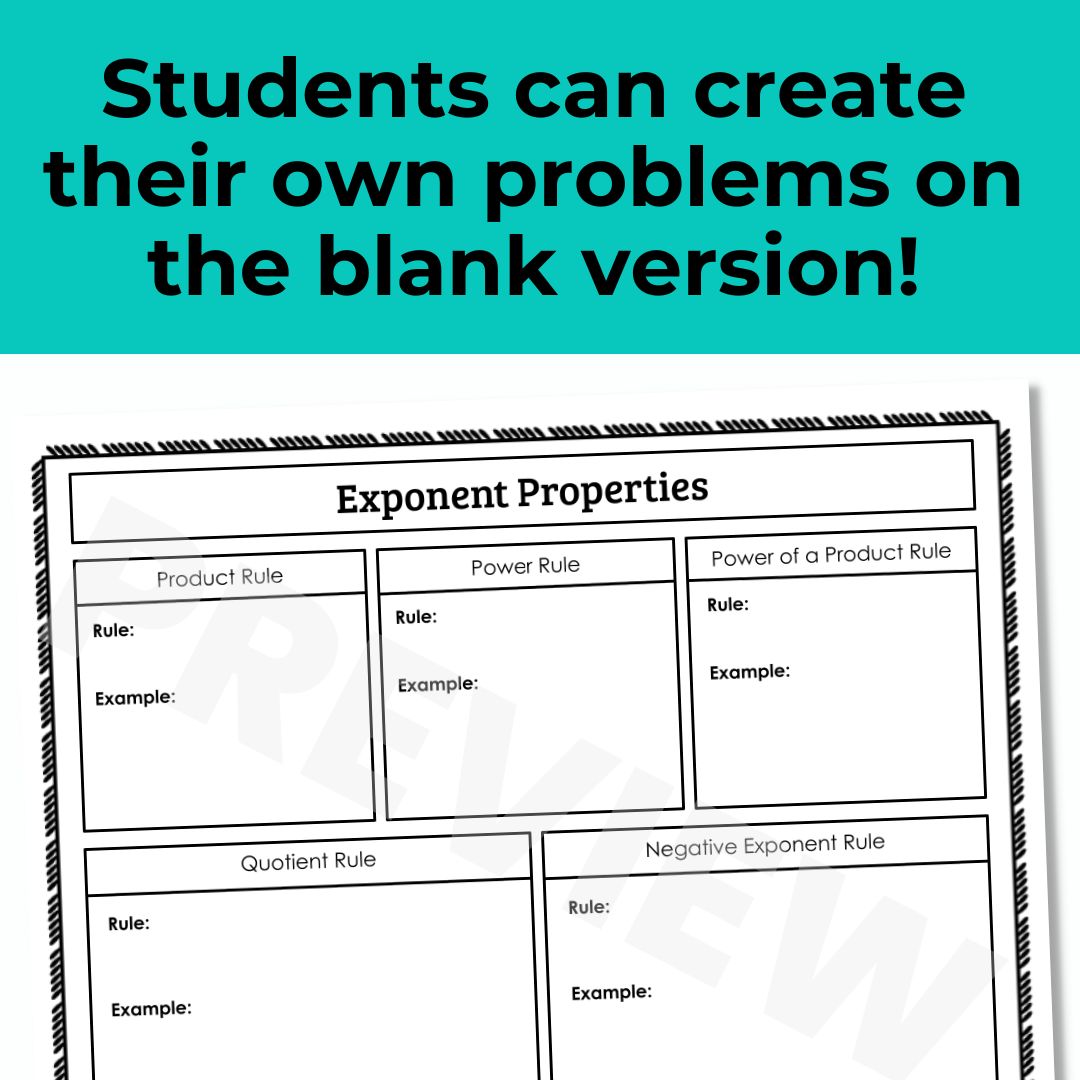 Supplement your guided notes with these exponent rules graphic organizers. This resource compares 5 properties of exponents including product rule, power of a product, power of a power, quotient rule, and negative exponents.