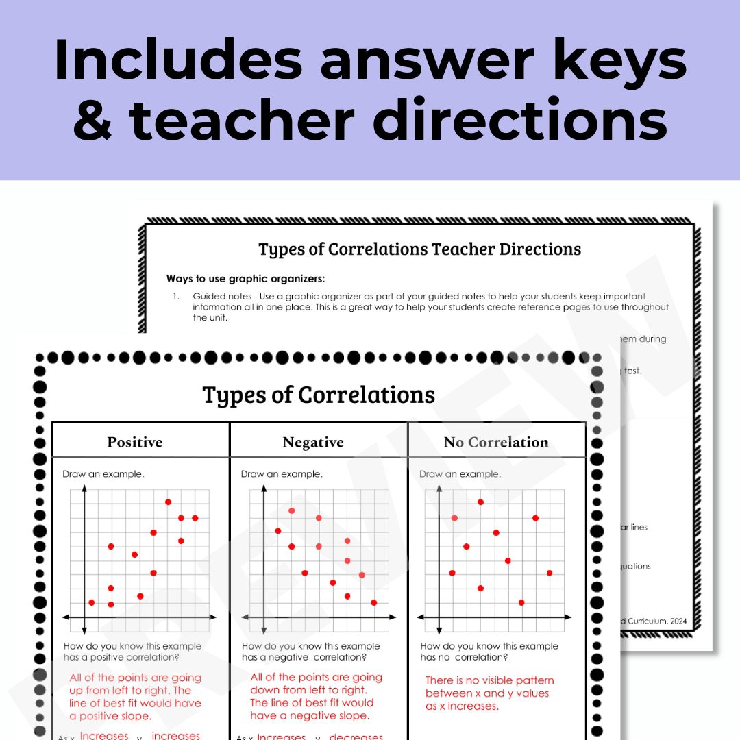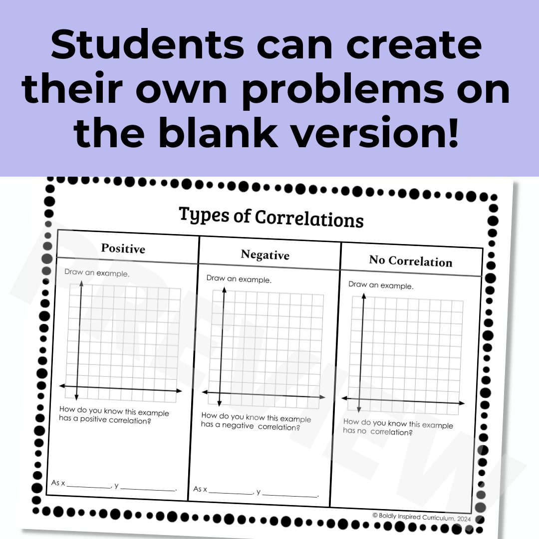 Supplement your scatter plots guided notes with this scatter plots correlations graphic organizer. This resource introduces positive, negative, and no correlation with graphs and example problems.