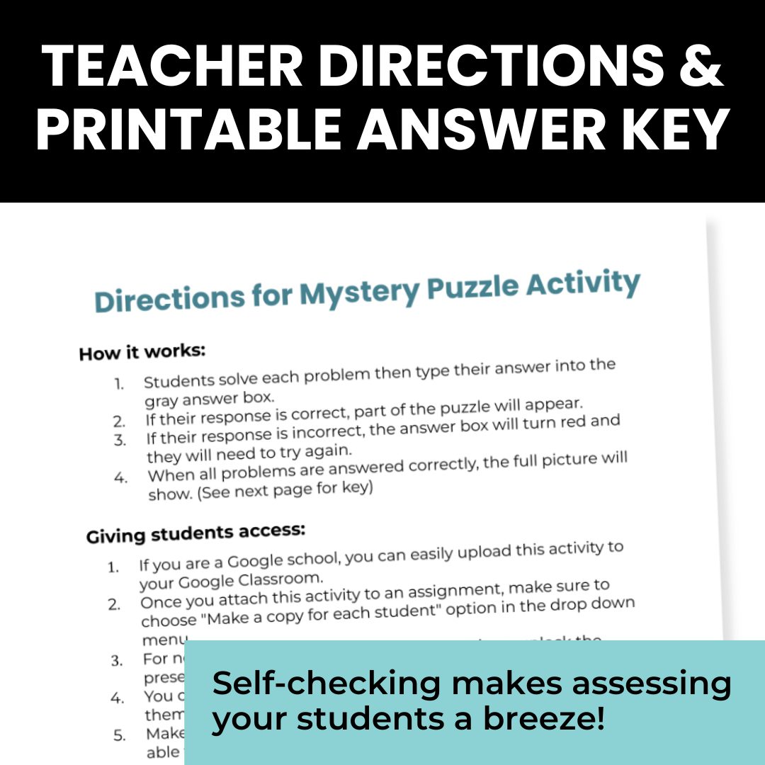 Digital version – Share this activity with your students directly through Google Classroom or have them make a copy of your view only version. When a student solves each problem correctly, pieces of the mystery picture will appear.