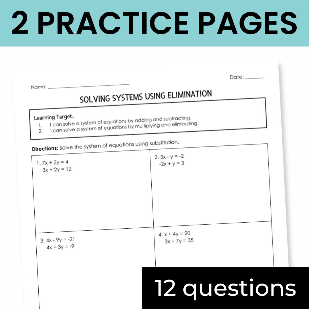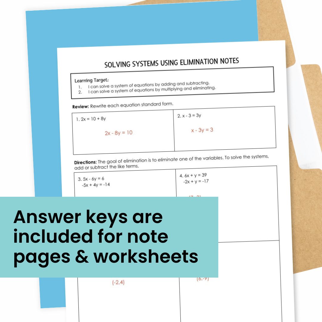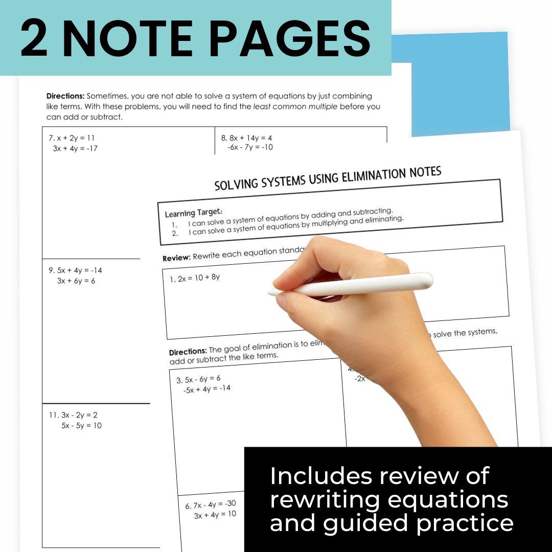 These solving systems of equations by elimination notes and practice worksheet create the perfect no-prep lesson plan. The guided notes are complete with review of rewriting linear equations, prompting questions, and example problems for solving linear systems using elimination.