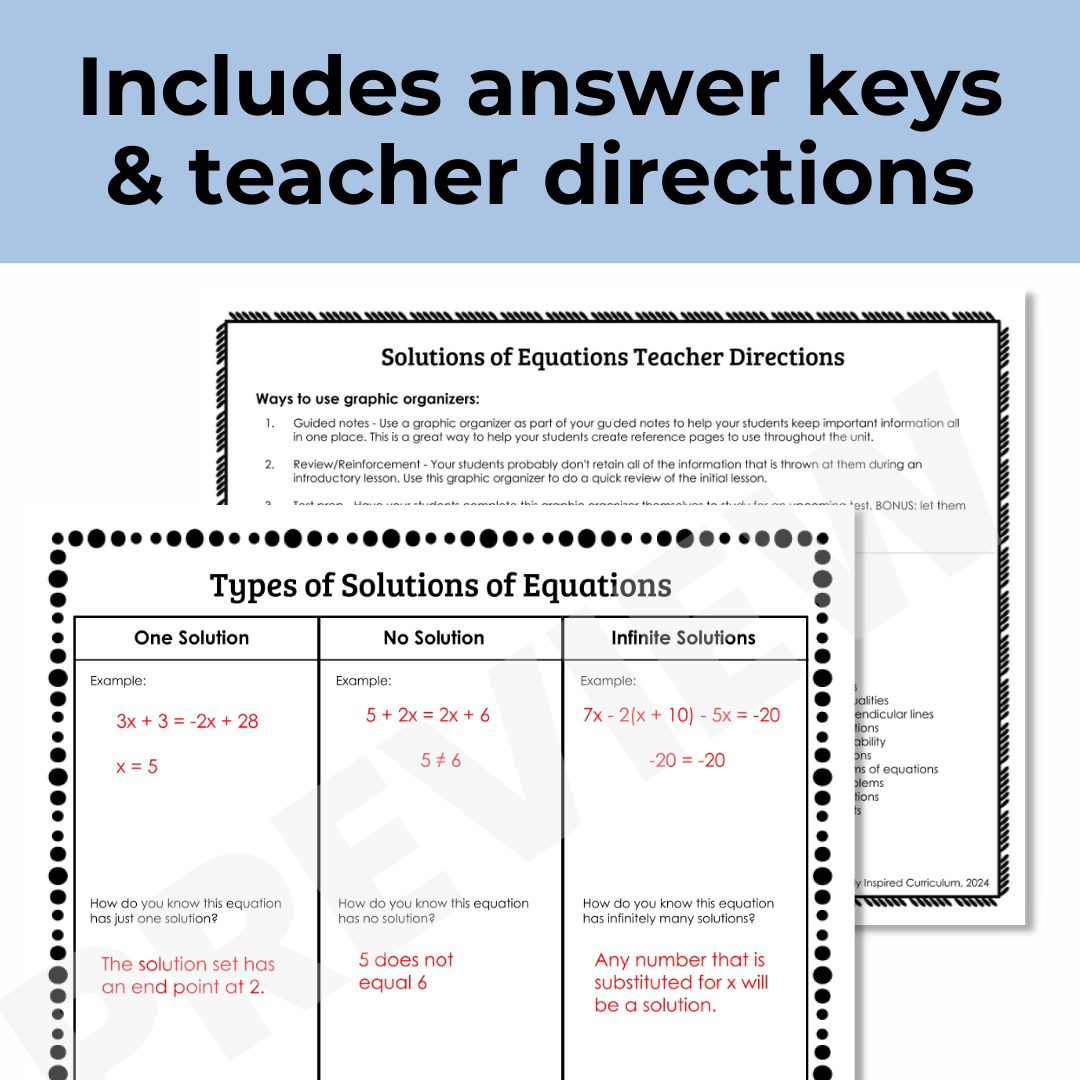 Add these solutions of multi step equations graphic organizers to your Algebra 1 guided notes! This resource includes one solution, no solution, and infinitely many solutions of equations with variables on both sides.