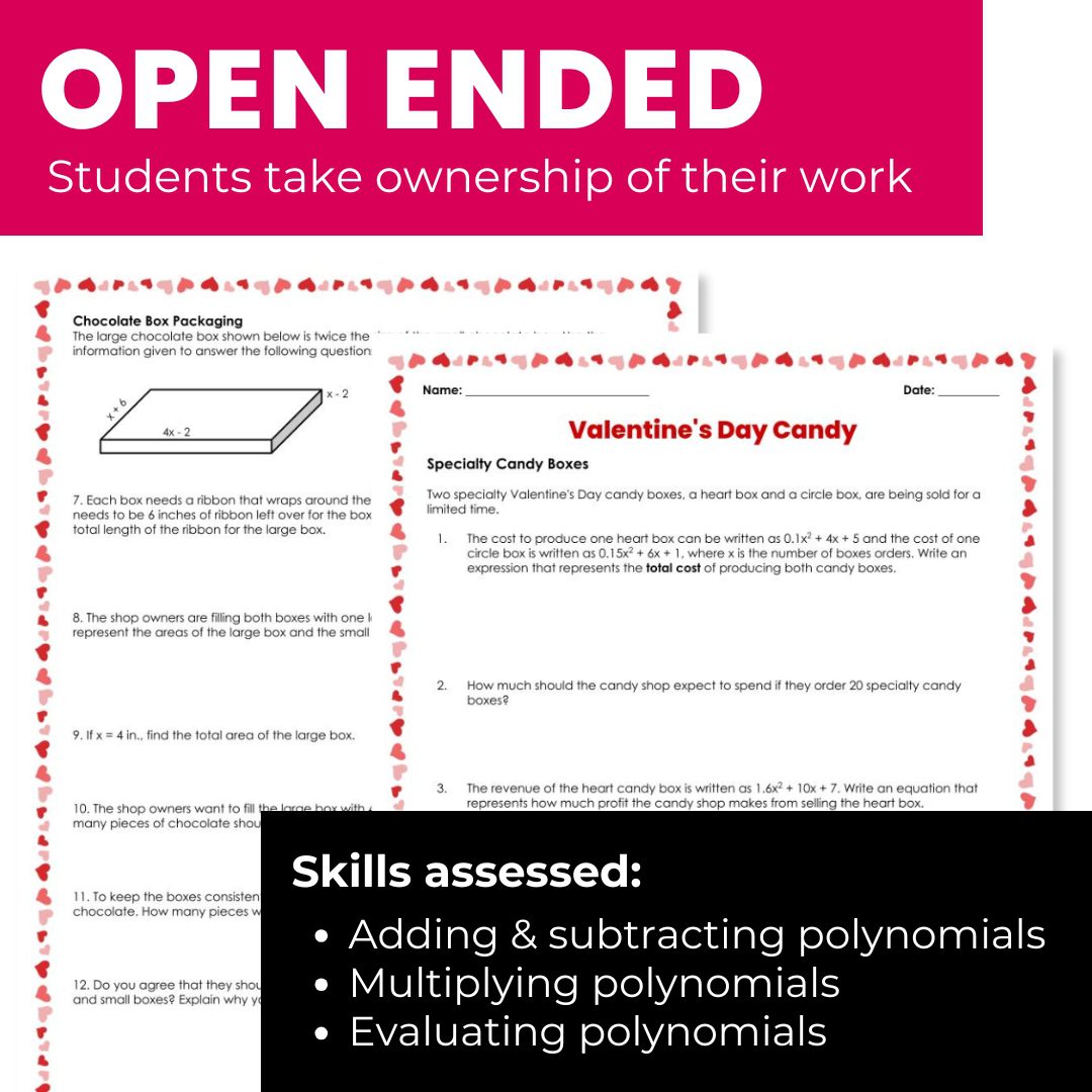 This Valentines Day activity for Algebra 1 gets your students thinking critically about polynomial operations and how polynomials can be related to real life.